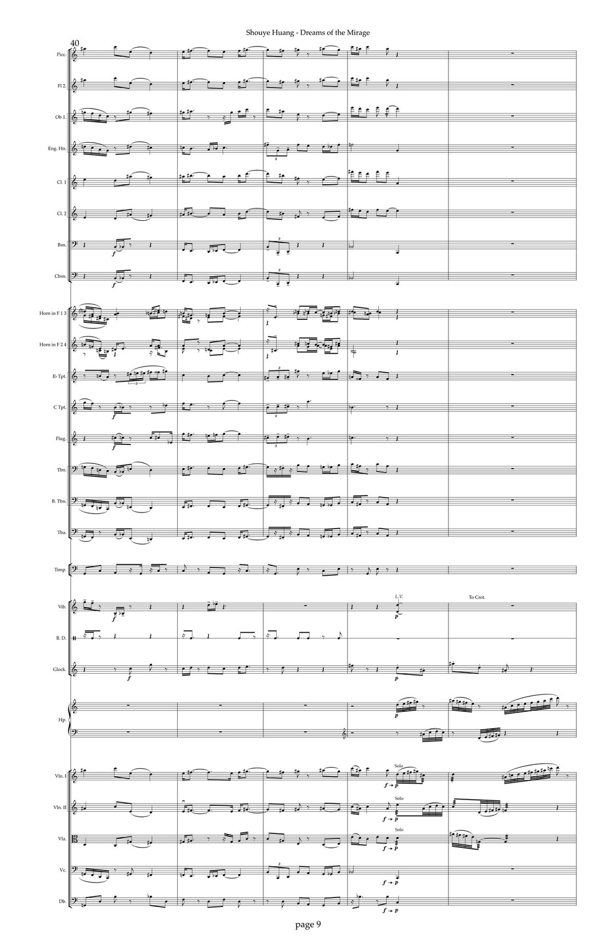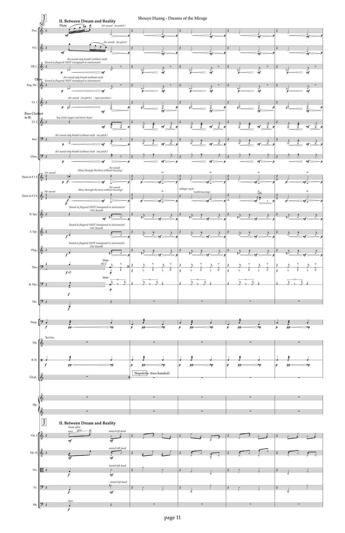 The second section, II. Between Dream and Reality, consists largely of extended techniques. Specifically, I used many instruments to create air sounds and white-noise textures—for example, woodwinds playing without reeds, brass without buzzing, and strings on the bridge with muted left hands. Some materials stand out for their distinctive color: brass with dif erent mutes, vibraphone played with medium soft xylophone mallets and bowing to create pitch bending, trombones producing metallic impacts with the slide, and double basses creating percussive effects by drumming on the body of the instrument.